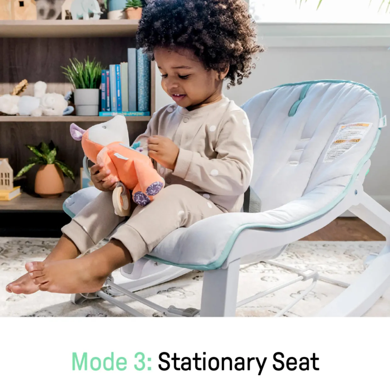 - This seat has 3 modes for parent convenience and baby preference: bouncing, rocking, and stationary seat (kickstand at the rear of the chair)