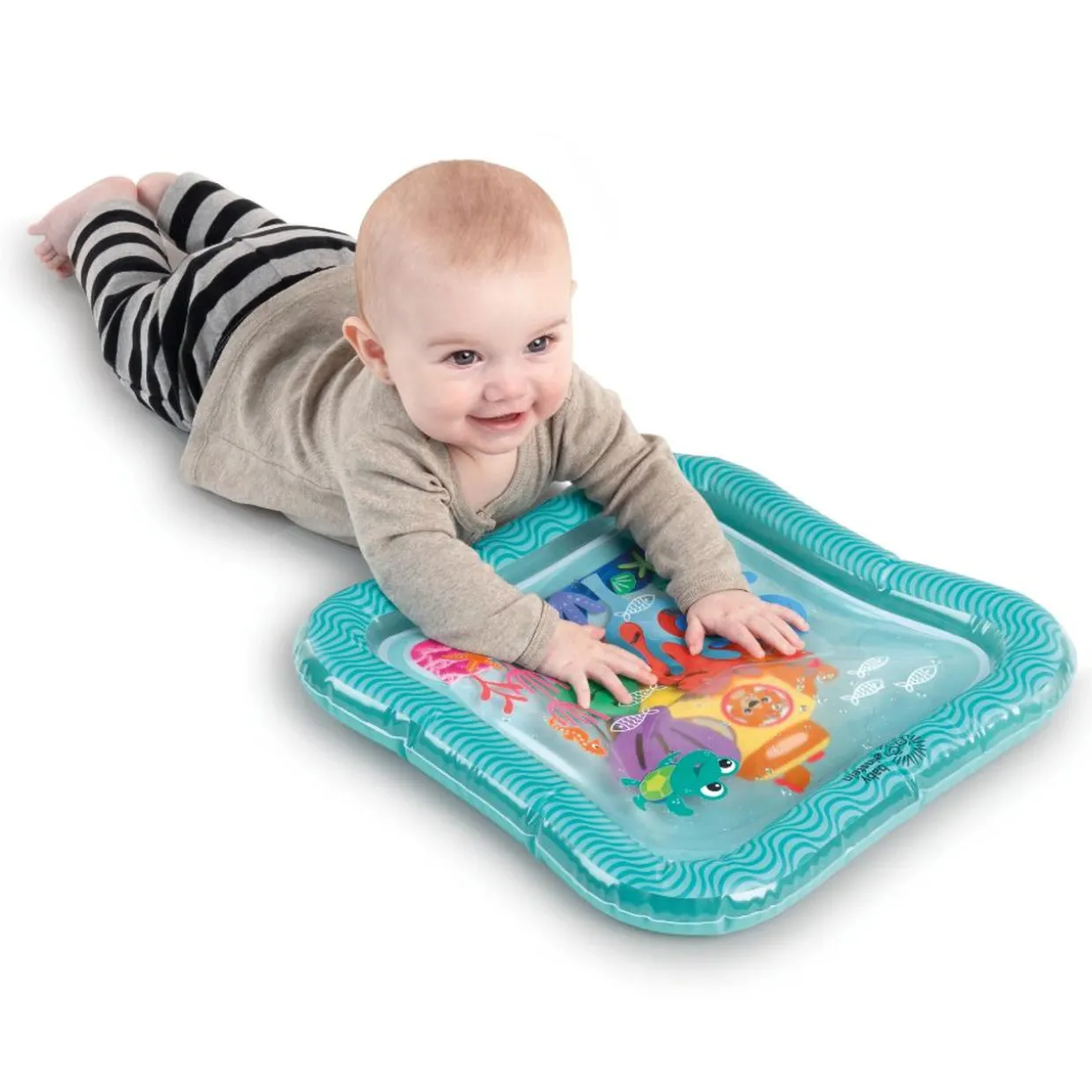 - Ocean-themed, tummy time mat engages baby’s senses through mess-free water play and encourages fine motor skill development as baby bats or pushes 3 floating creatures.