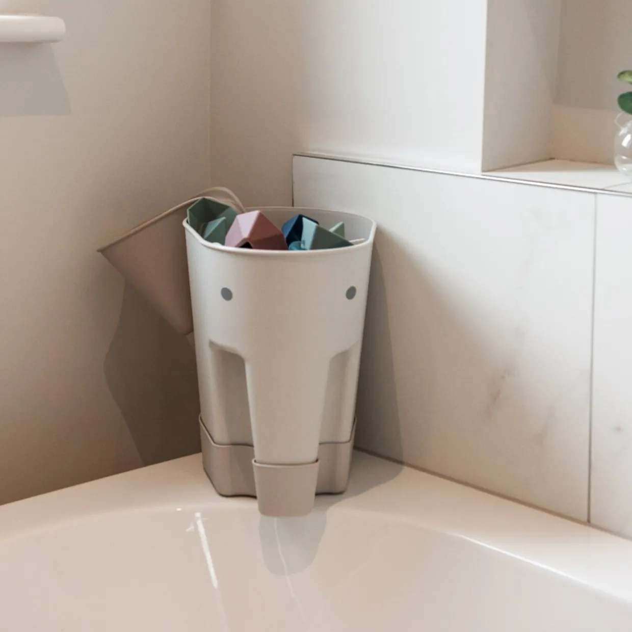 - Ellie’s trunk acts as handle to comfortably scoop up toys