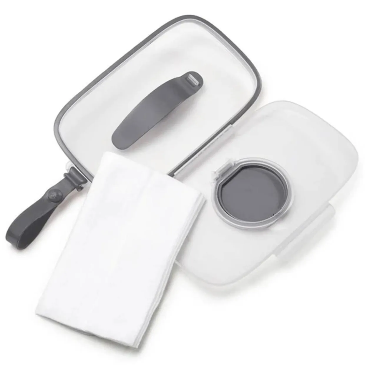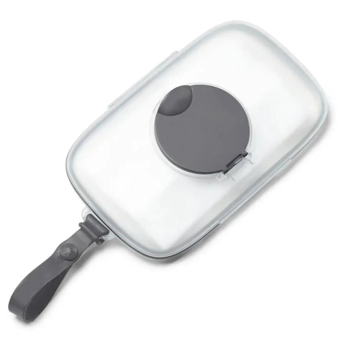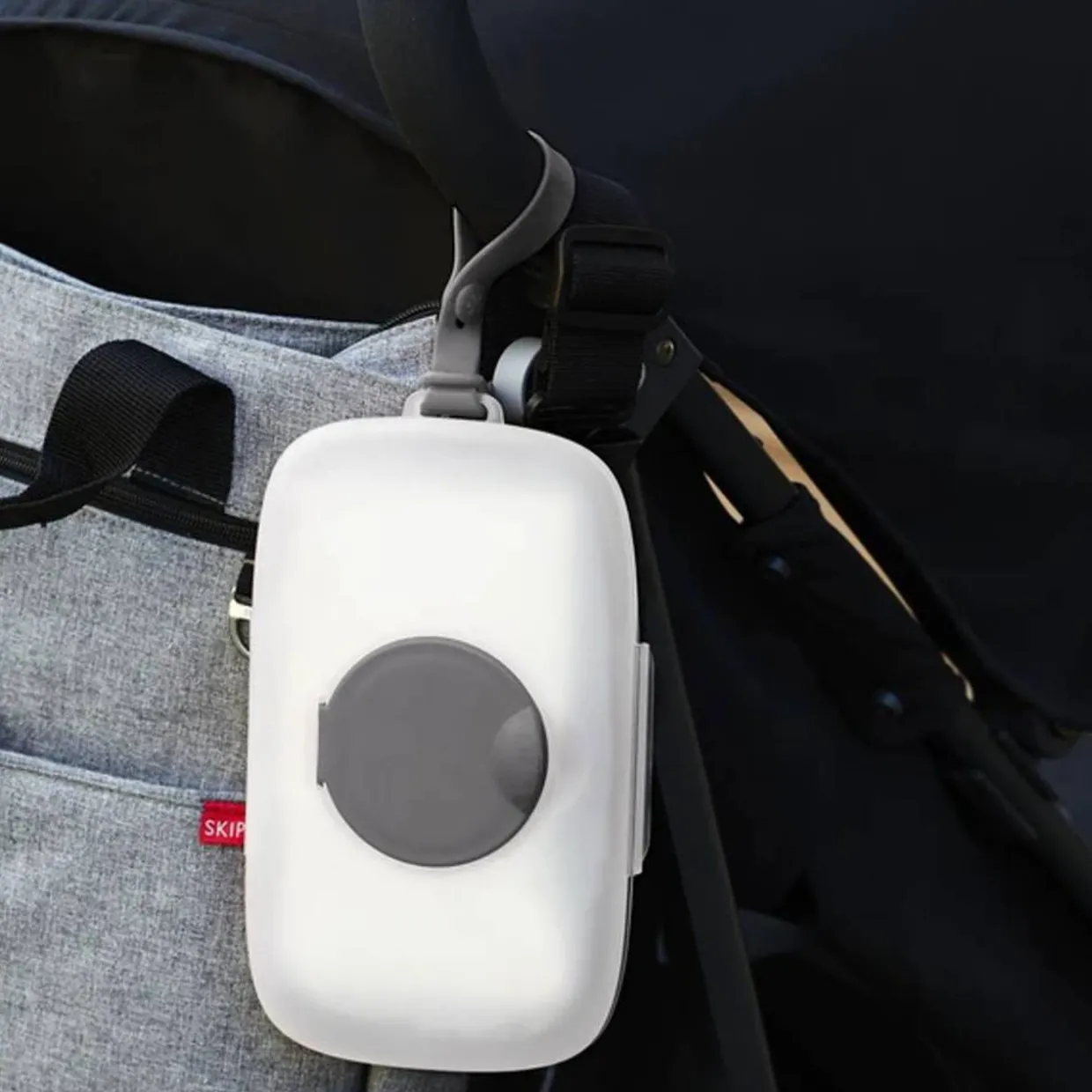 - Silicone strap attaches to pram or bag for easy access